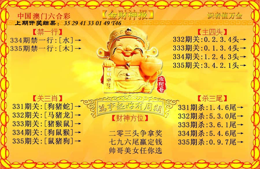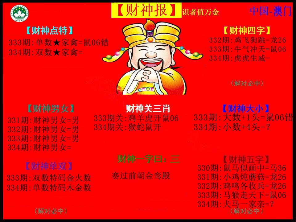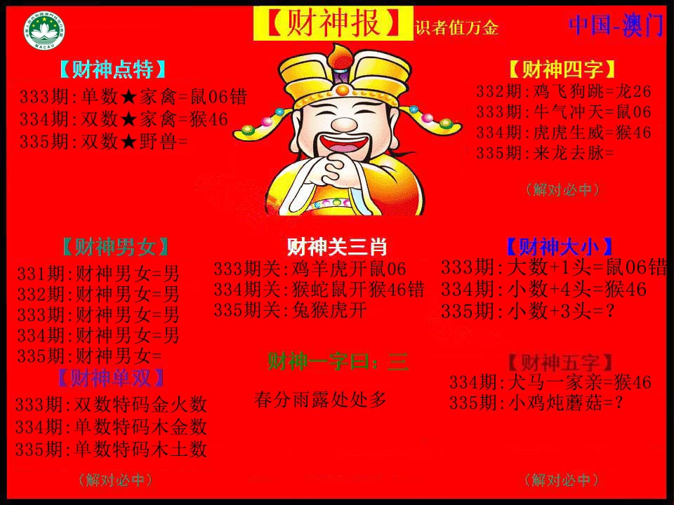 | 334期: 买啥都中 【野兽野兽野兽】开:猴46准 |